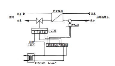 本系統(tǒng)應(yīng)用于供暖系統(tǒng)的熱交換器控制。通過安裝于循環(huán)水管上的 TE-1 溫度傳感器實時檢測溫度。反饋給 TC-1 溫度控制由控制器設(shè)定 值與傳感器信號比較。輸出相應(yīng)的電壓控制信號,控制 TV-1 的蒸汽量。 控制熱交換器的交換熱能,實現(xiàn)供暖循環(huán)的溫度恒定。|